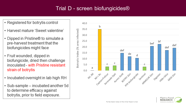 In 2019, a trial was conducted on citrus trees to evaluate the effectiveness of Ground Spread, a by-product of the BOTRY-Zen® production process, in controlling Brown Rot. Results indicated promising potential for reducing disease pressure when used post-harvest.